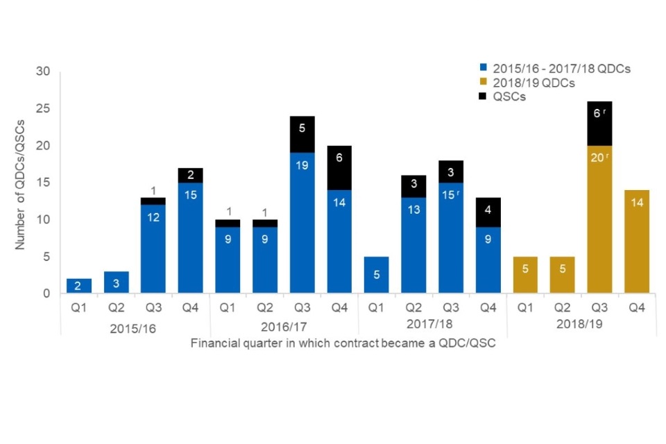 This annual publication includes analysis of all contracts that became a QDC/QSC between 1 April 2017 and 31 March 2019, and includes data for Quarter 4 2018/19 within the quarterly series of bulletins. Data is also presented from April 2015, when the first QDC was entered into.