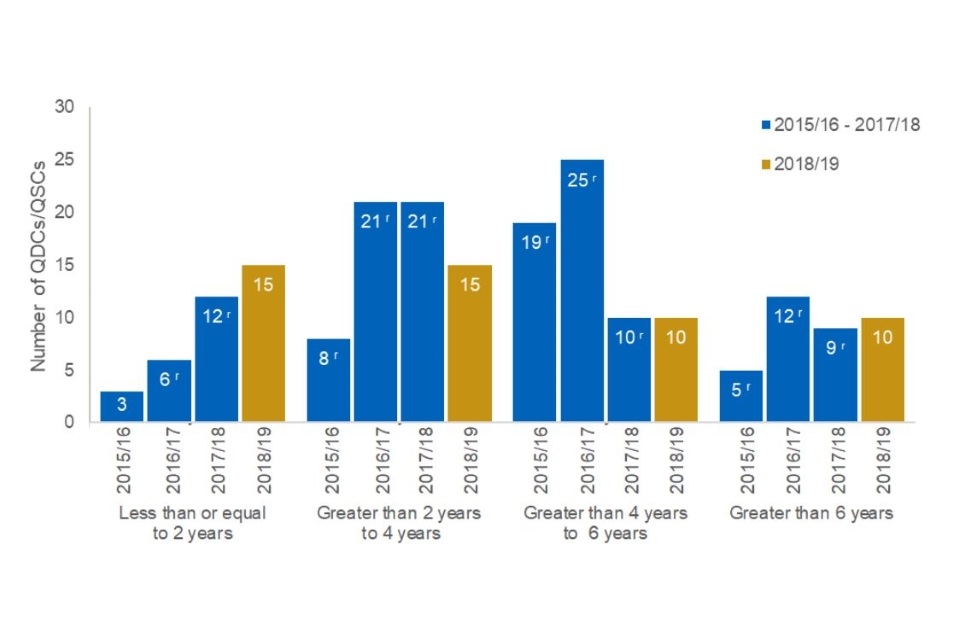 The average (mean) estimated duration of QDCs/QSCs has increased this financial year, from 3.9 years in 2017/18 to 4.3 years in 2018/19 (see Table 1). The average estimated duration across all QDCs/QSCs was 4.4 years.
