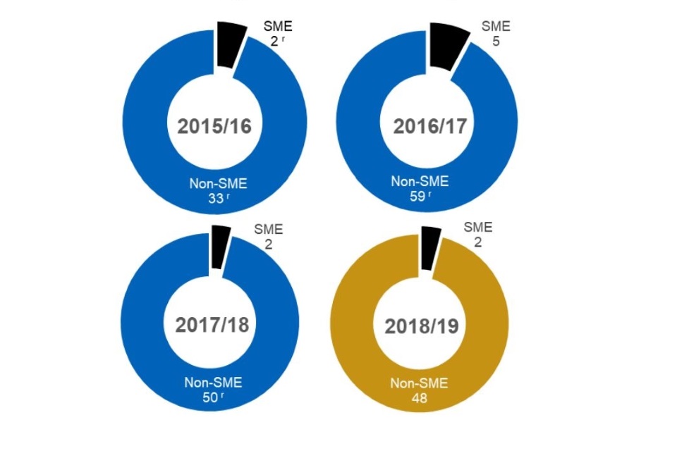 There were 460 sub-contracts with a value greater than £1 million reported to the SSRO: 130 in 2015/16, 176 in 2016/17, 68 in 2017/18 and 86 in 2018/19. The proportion of these sub-contracts that were with SMEs has been steadily increasing year on year, from 8 per cent in 2015/16 to 23 per cent in 2018/19. In total, there were 65 sub-contracts with SMEs.