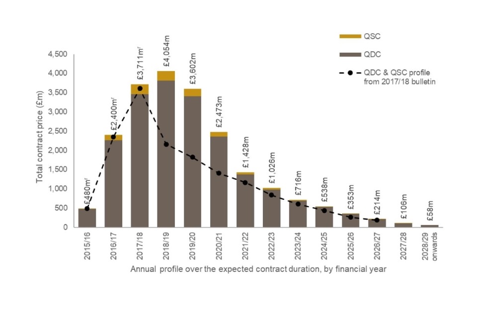 Note: Financial years from 2028/29 onwards have been combined due to low numbers of QDCs/QSCs reporting in these years. In some cases, the total contract price broken down by annual profile did not equal the total contract price reported elsewhere in the contract reports. The ‘profile from 2017/18 bulletin’ series is as reported in the previous annual bulletin, and so has not been updated for any corrections or any late submissions made within the last year.