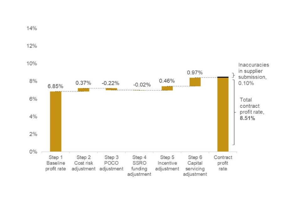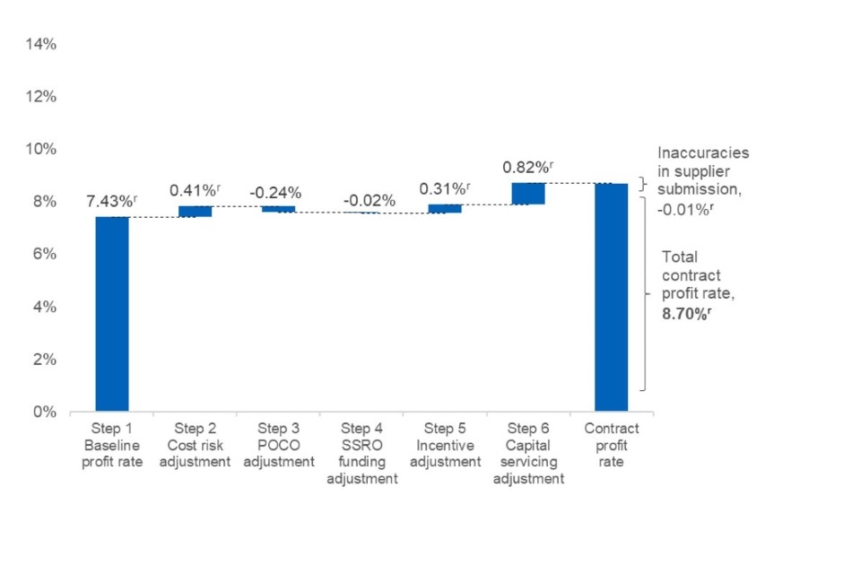 The Defence Reform Act 2014 and the Single Source Contract Regulations 2014 together prescribe a six-step process which should be used to determine the contract profit rate for a QSC/QSC. For more information on these six steps, please refer to the SSRO’s Guidance on the baseline profit rate and its adjustment. The data presented in this section is based on estimated profit rates at the time of agreement and does not necessarily represent the profit that will be achieved once the contract is complete. One QDC/QSC did not provide any profit rate step data, and so it has been excluded from the analysis in this section.