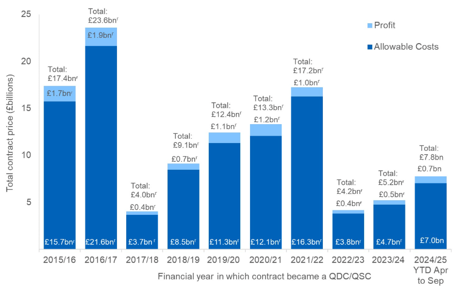 | Financial year in which contract became a QDC/QSC | Allowable Costs (£m) | Profit (£m) | Total Contract Price (£m) |